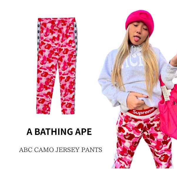 LANAはABC CAMO柄のトラックパンツを着用。この柄もAPEのアイコニックなデザインです。